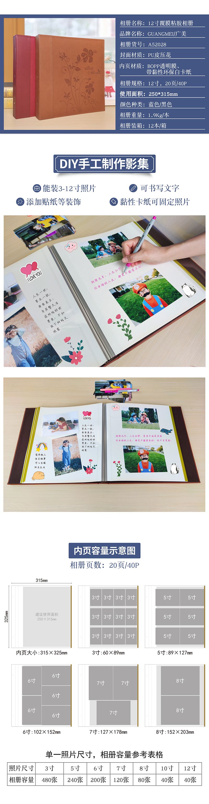 螺丝装PU皮封面12寸覆膜粘胶相册20张(带盒)
