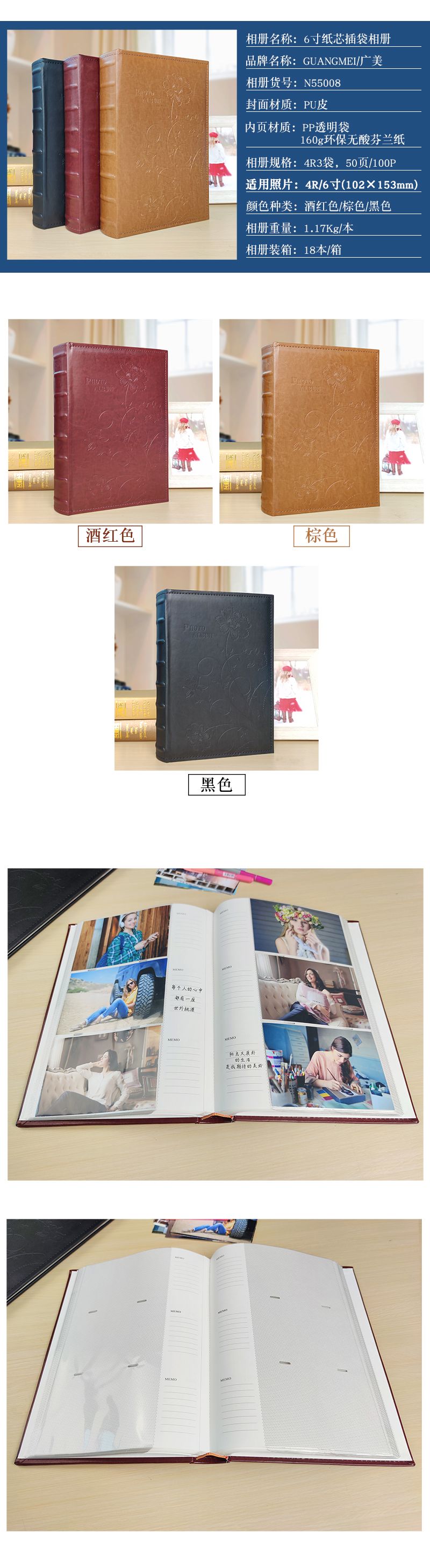 50页4R3袋竹节圆背PU皮封面纸芯相册可装300张相片
