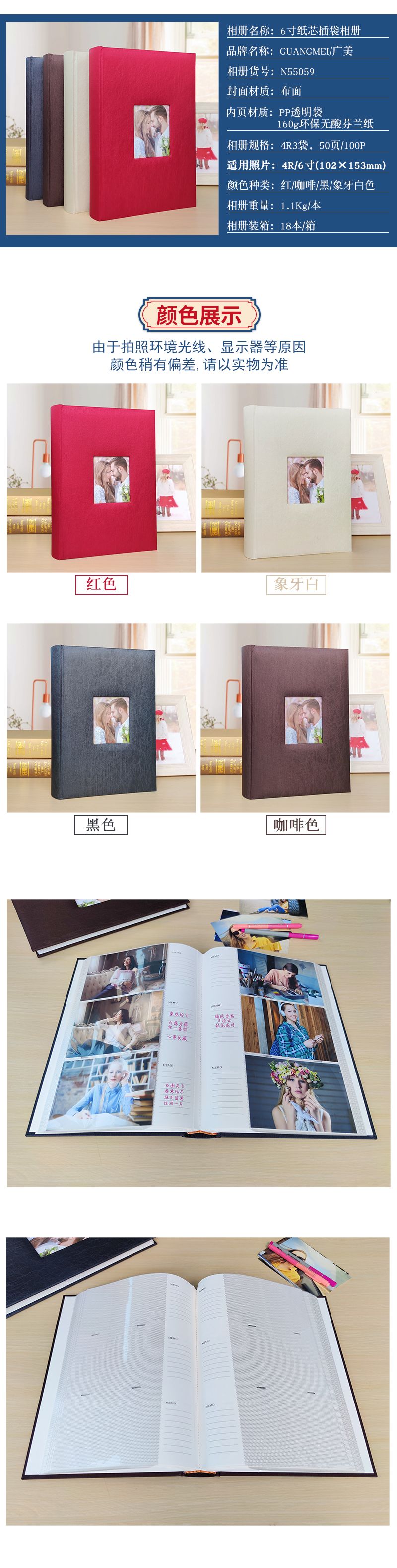 4R3袋50页纸芯布面圆背相册可装300张相片